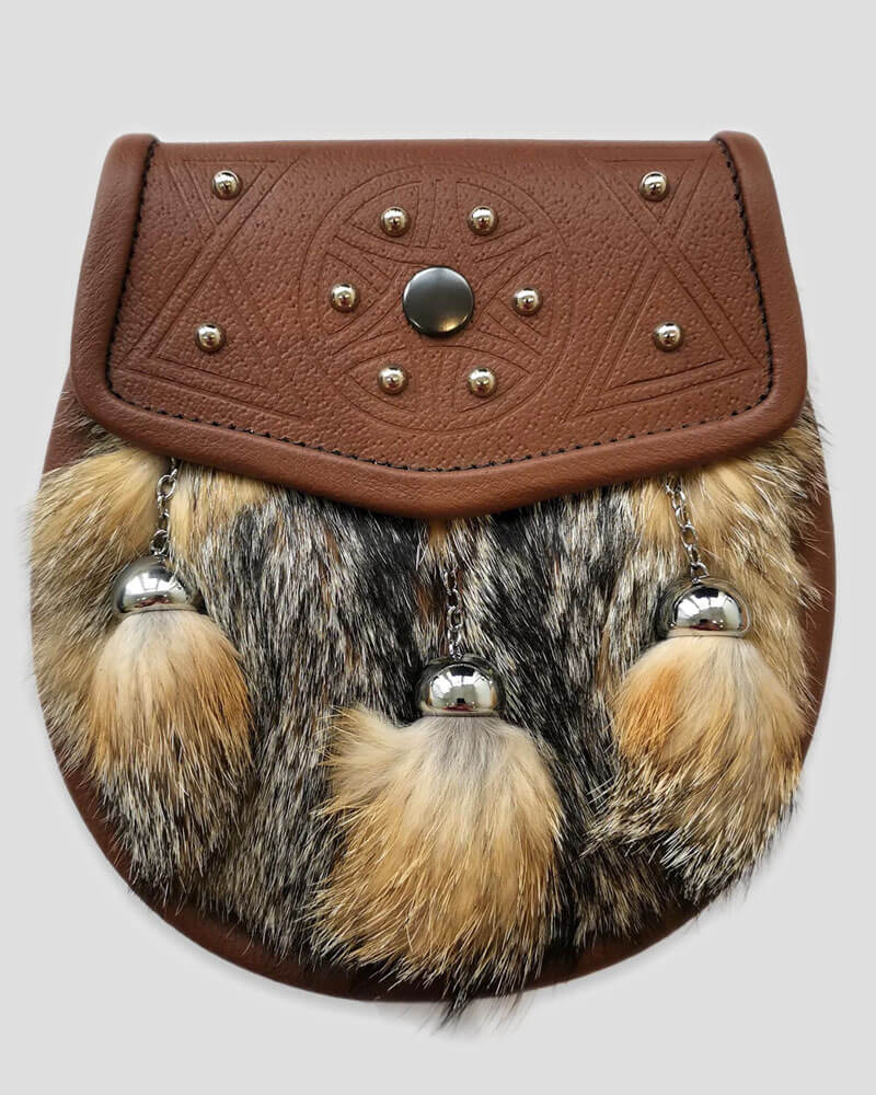 This Celtic Star Semi-Dress Sporran combines beauty and functionality. The grey fox fur showcases natural shades of silver, black, and white, perfectly contrasting with the warm brown leather. The intricate Celtic design and shiny metal studs enhance its visual appeal. Perfect for traditional or modern kilts, this Semi-Dress Kilt Sporran with Leather and Pelt is designed for men who value style and practicality.