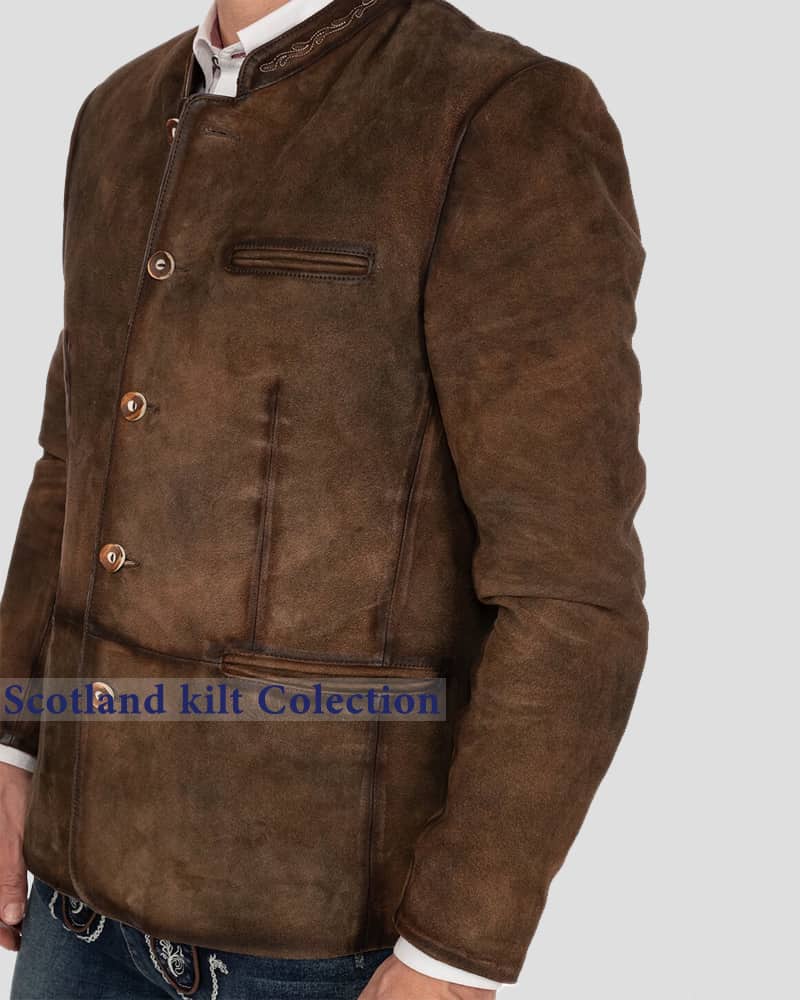 This Traditional Bavarian Suede Leather Jacket is crafted from premium suede leather and accented with authentic horn buttons and refined embroidery. Its rich, deep brown color offers timeless versatility, making it ideal for both everyday wear and festive celebrations.