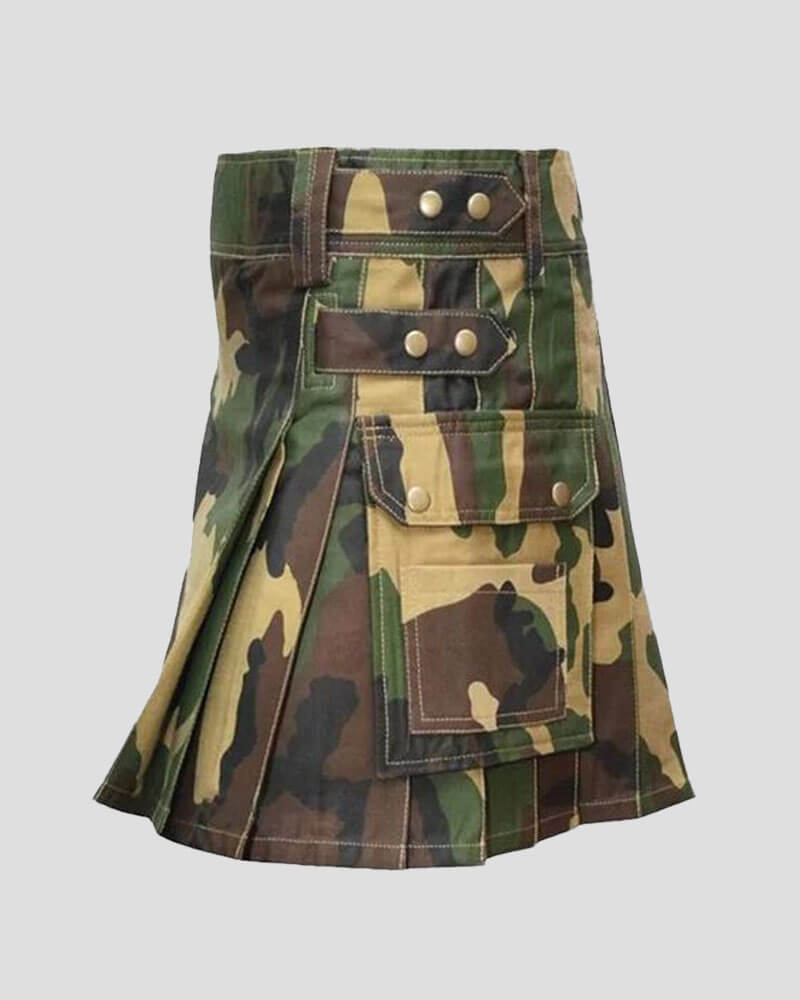 Designed for practicality, this kilt features multiple utility pockets on the sides, allowing you to carry small essentials like your phone, keys, or other personal items. These pockets are not only functional but also add to the overall military-inspired design. The camo print gives this kilt a bold and unique look, perfect for those who enjoy wearing something different. The design is carefully crafted to offer comfort without compromising on style, making it easy to wear for a variety of occasions. Whether you are out for a hike, spending time in the great outdoors, or simply running errands, this kilt has you covered.